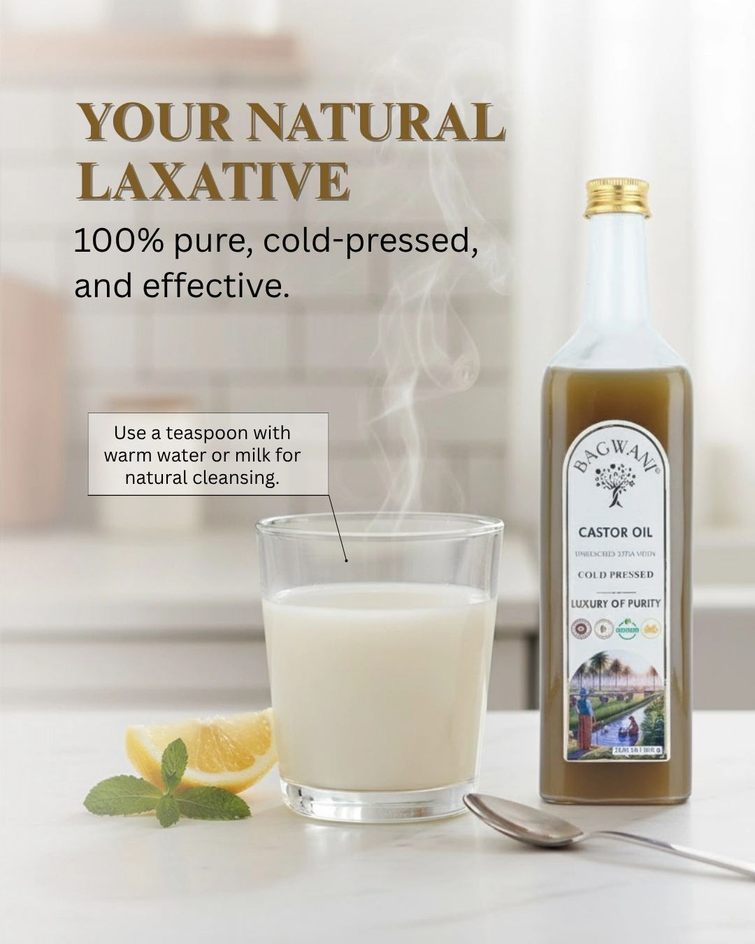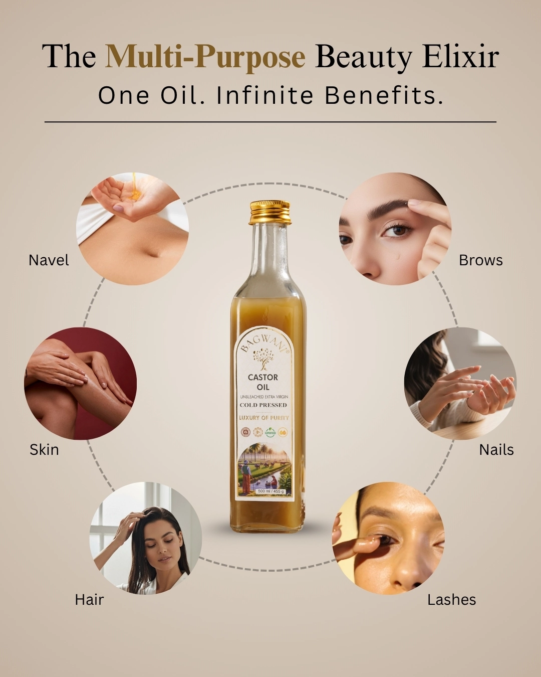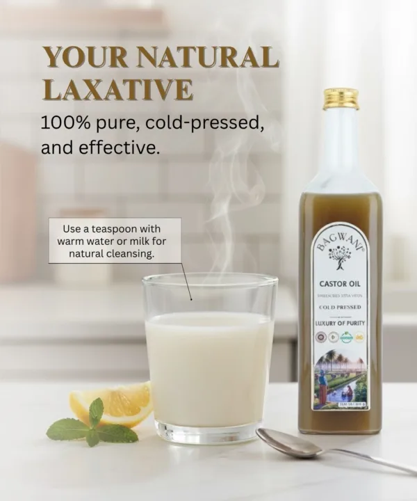 Castor oil from Bagwani is: – 100% natural, cold-pressed, and IP(Indian Pharmacopoeia) grade tested. No mineral oil, silicones, or hexane – Encourages hair growth and radiance. Reduces Wrinkles and hydrates Skin – Dermatologically proven to be skin-safe – Preservative-free, vegan, and gluten-free. 100% pure.