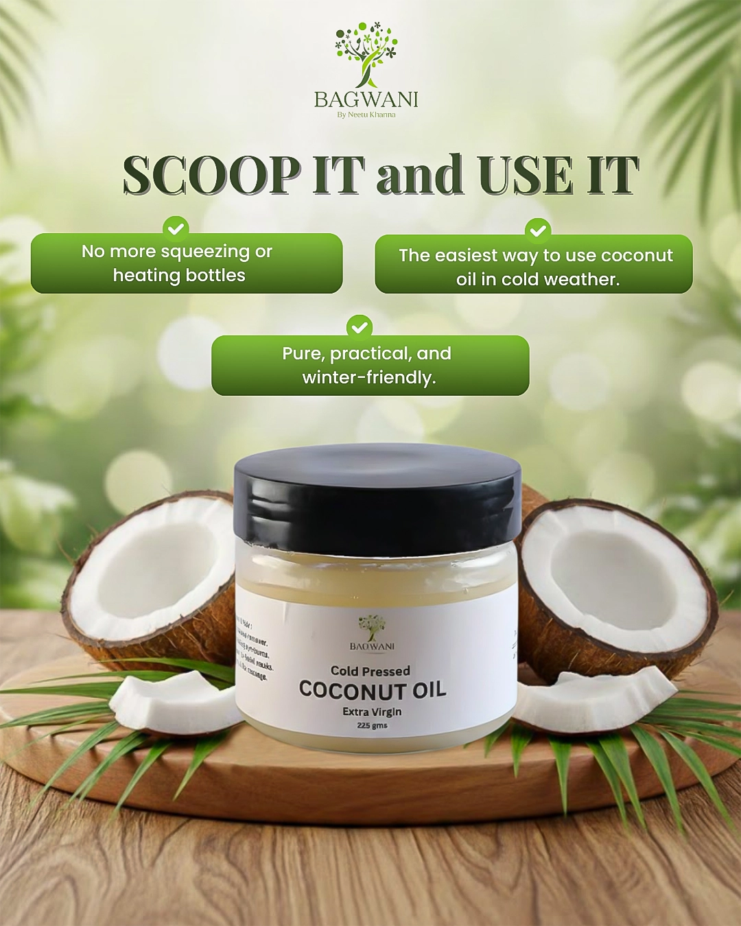 Made especially for winters, Bagwani cold-pressed extra virgin coconut oil comes in a wide-mouth jar to solve a common winter problem. This jar makes it easy to scoop, melt, and use without any struggle.